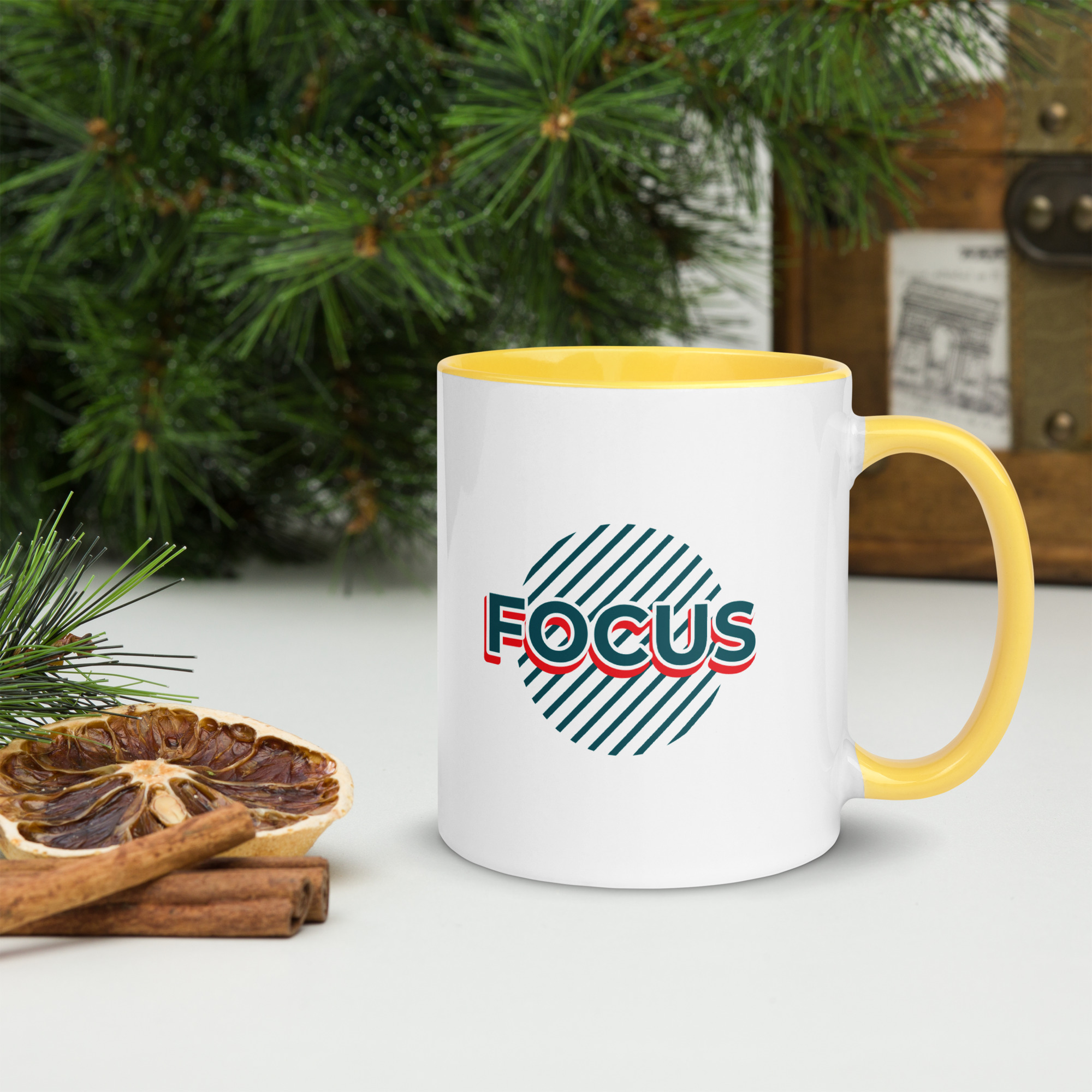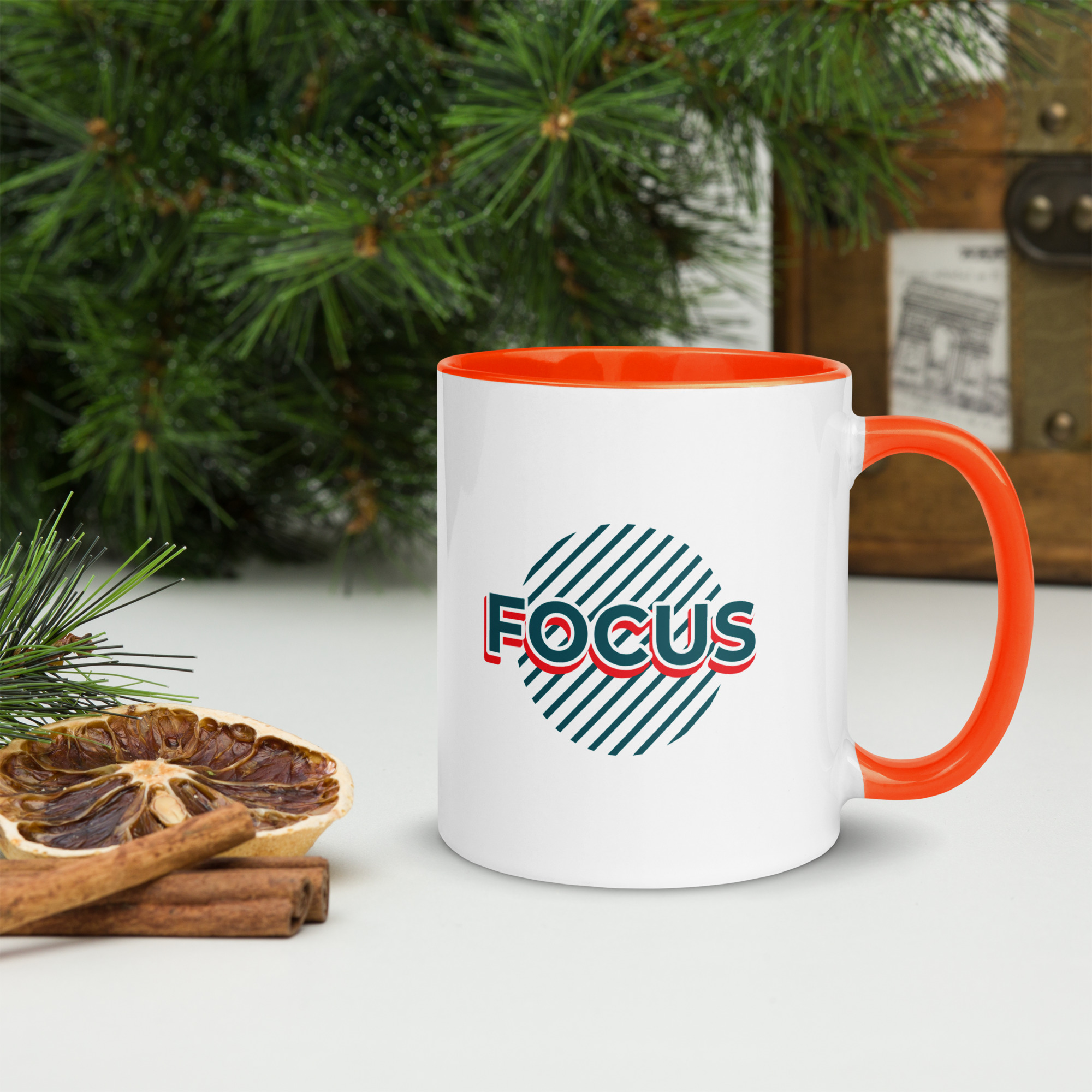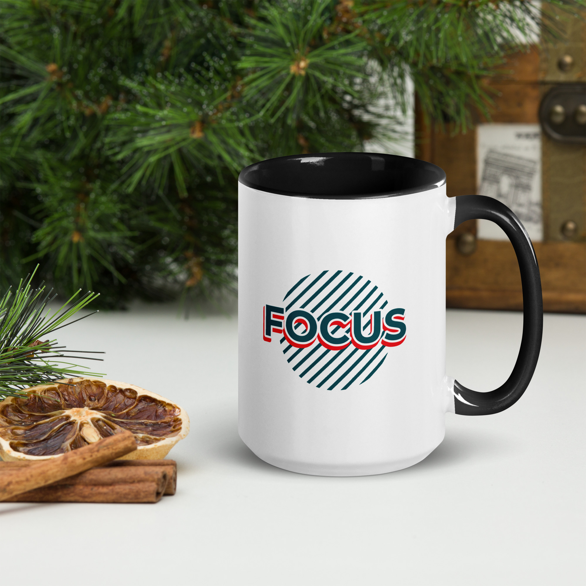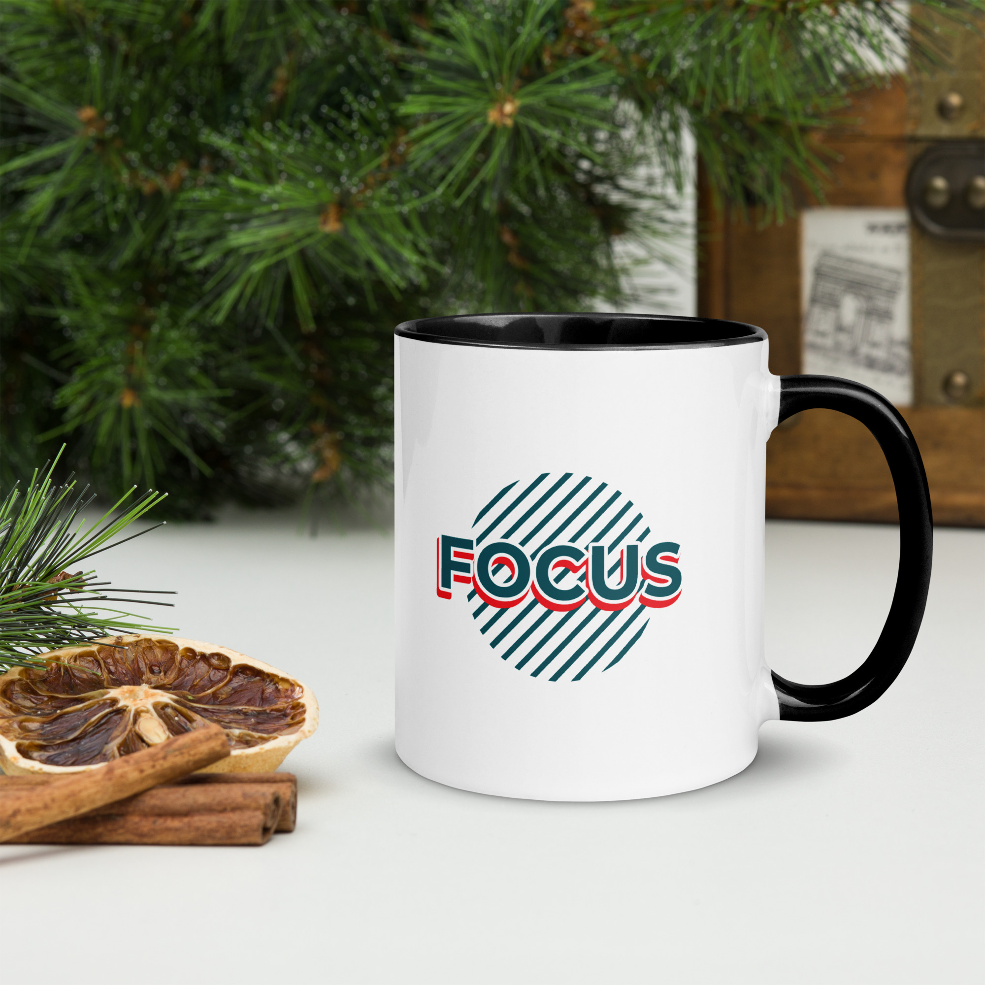 Baltas puodelis su spauda (įv.spalvų). ‘Focus’ dizainas