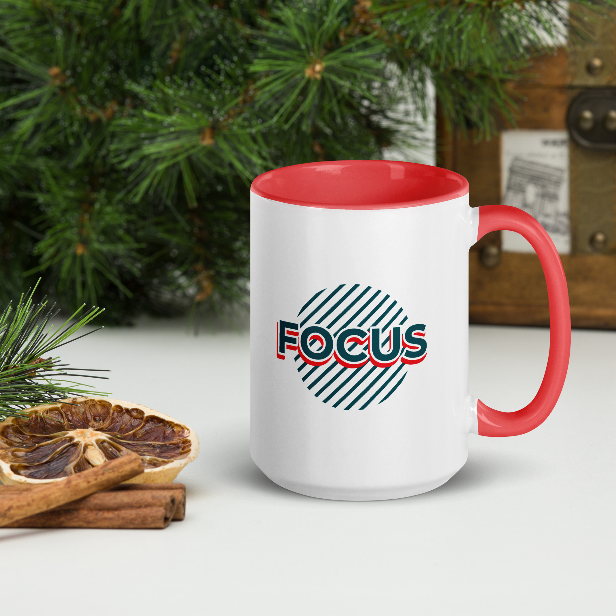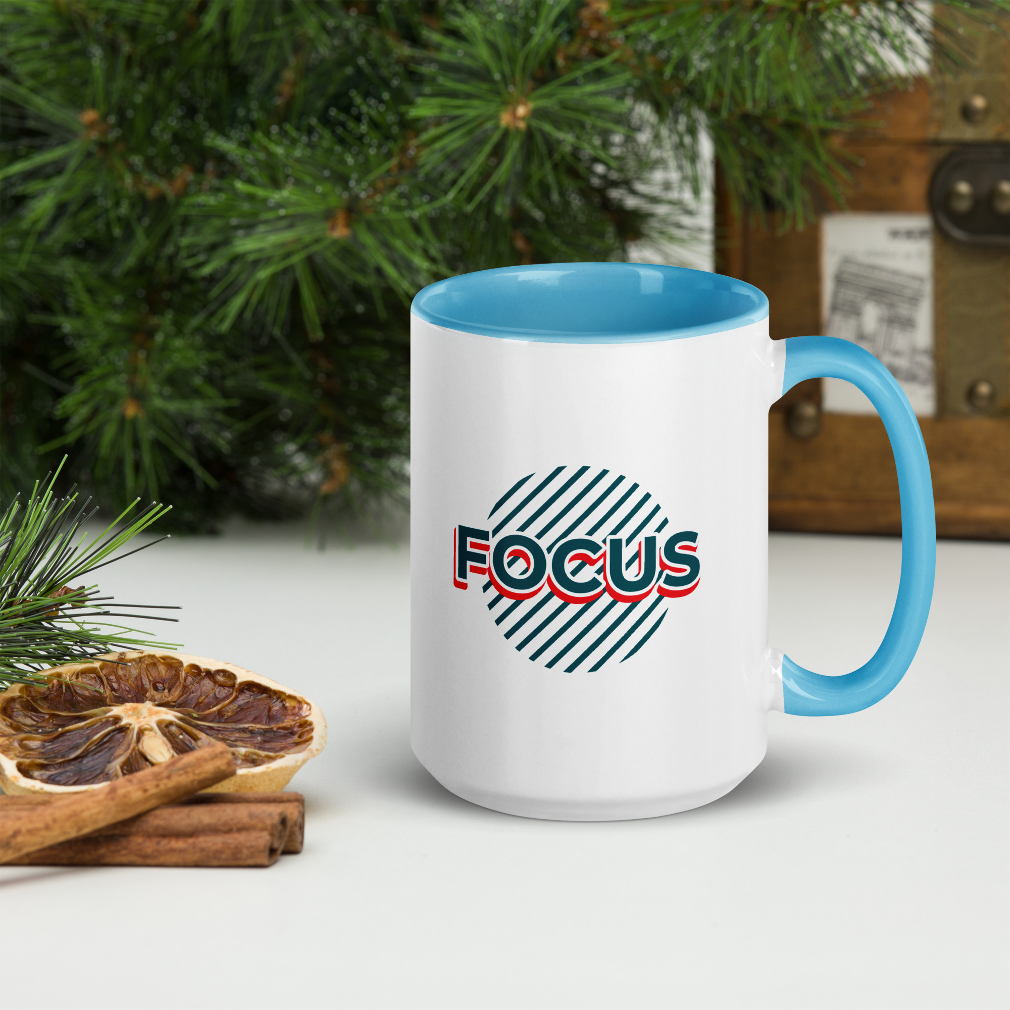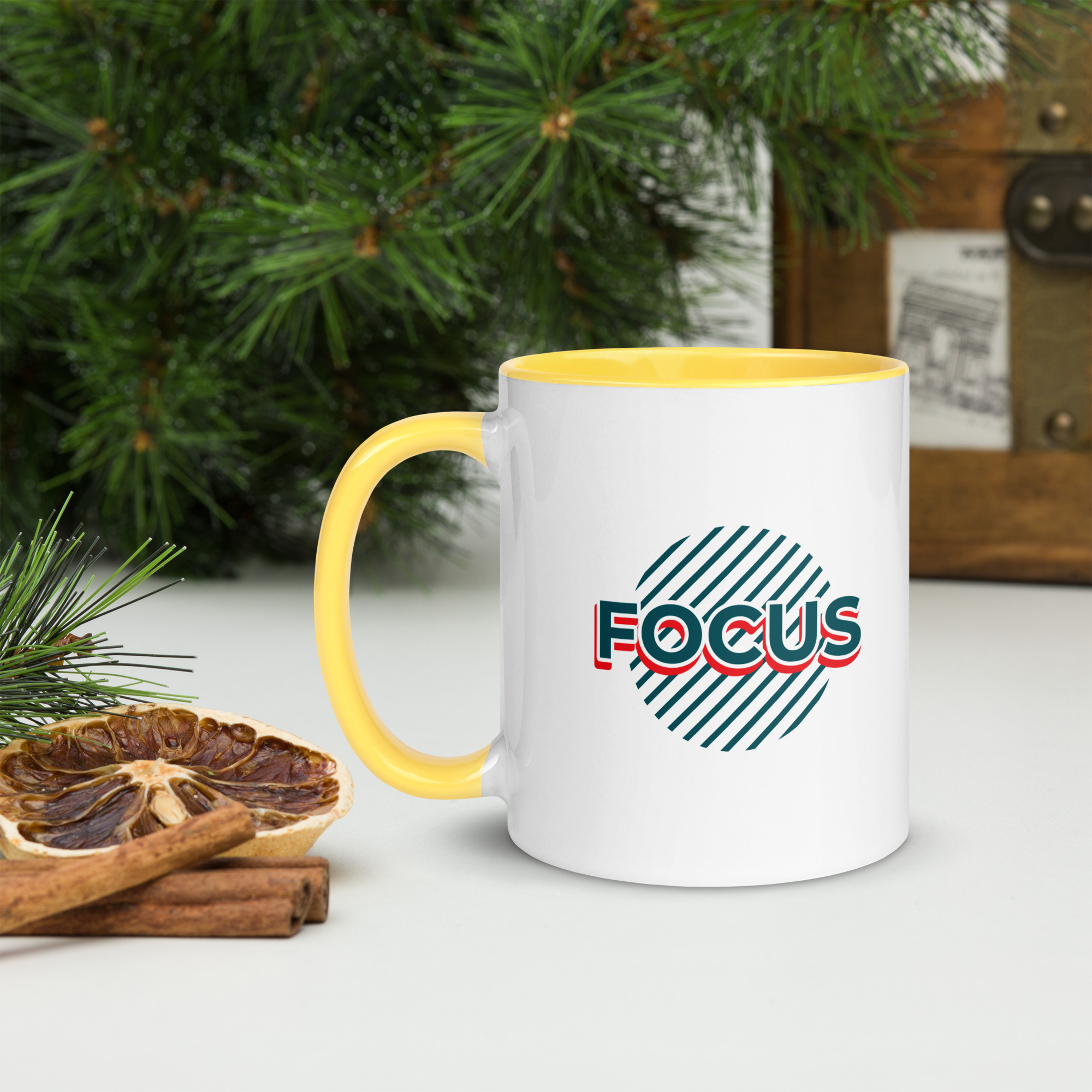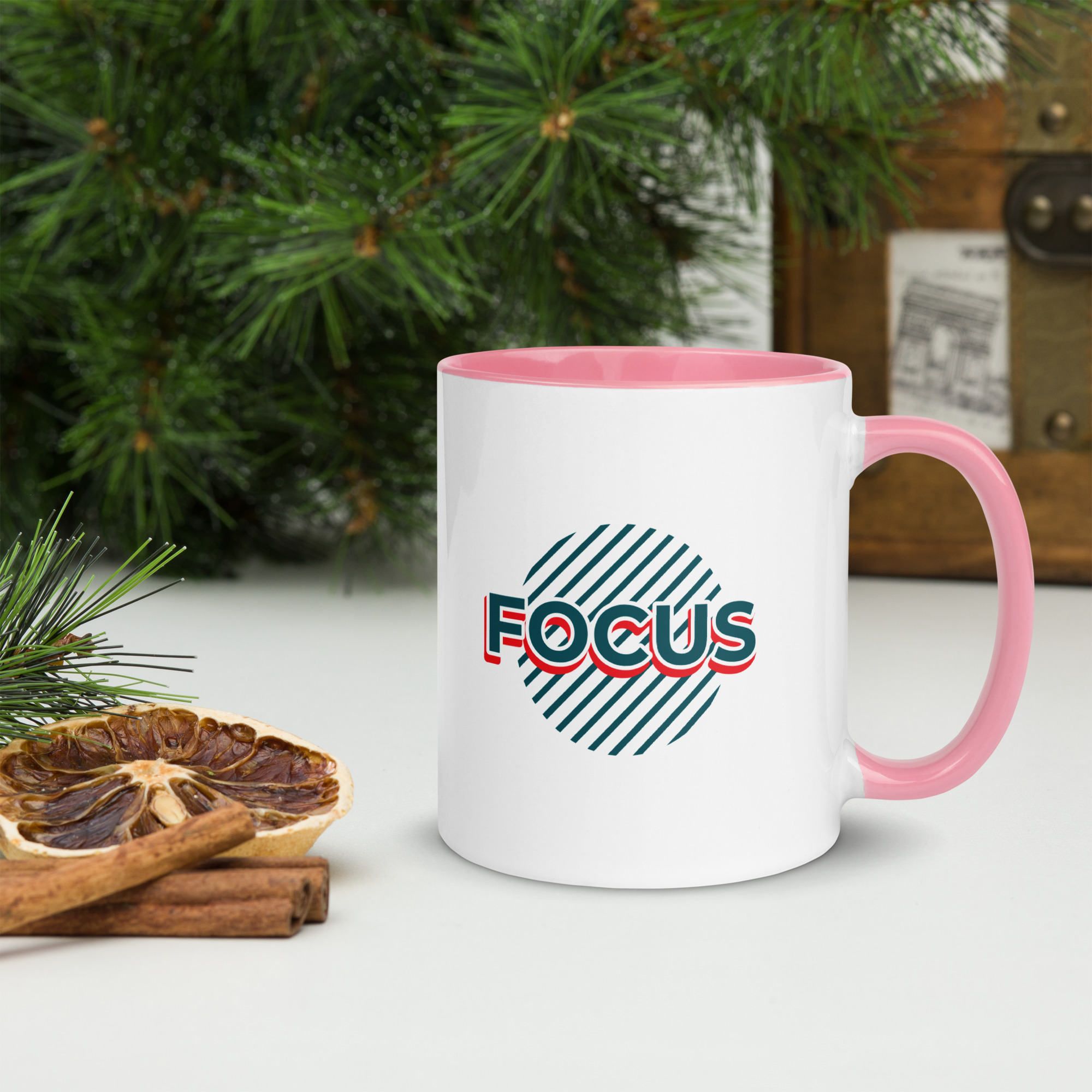 Baltas puodelis su spauda (įv.spalvų). ‘Focus’ dizainas