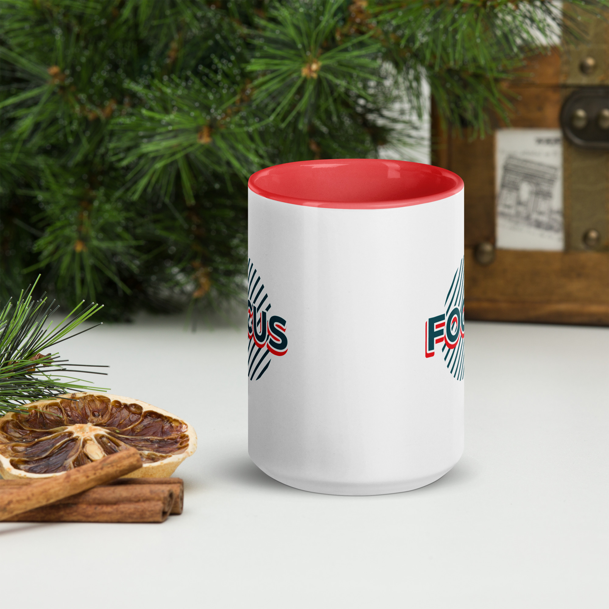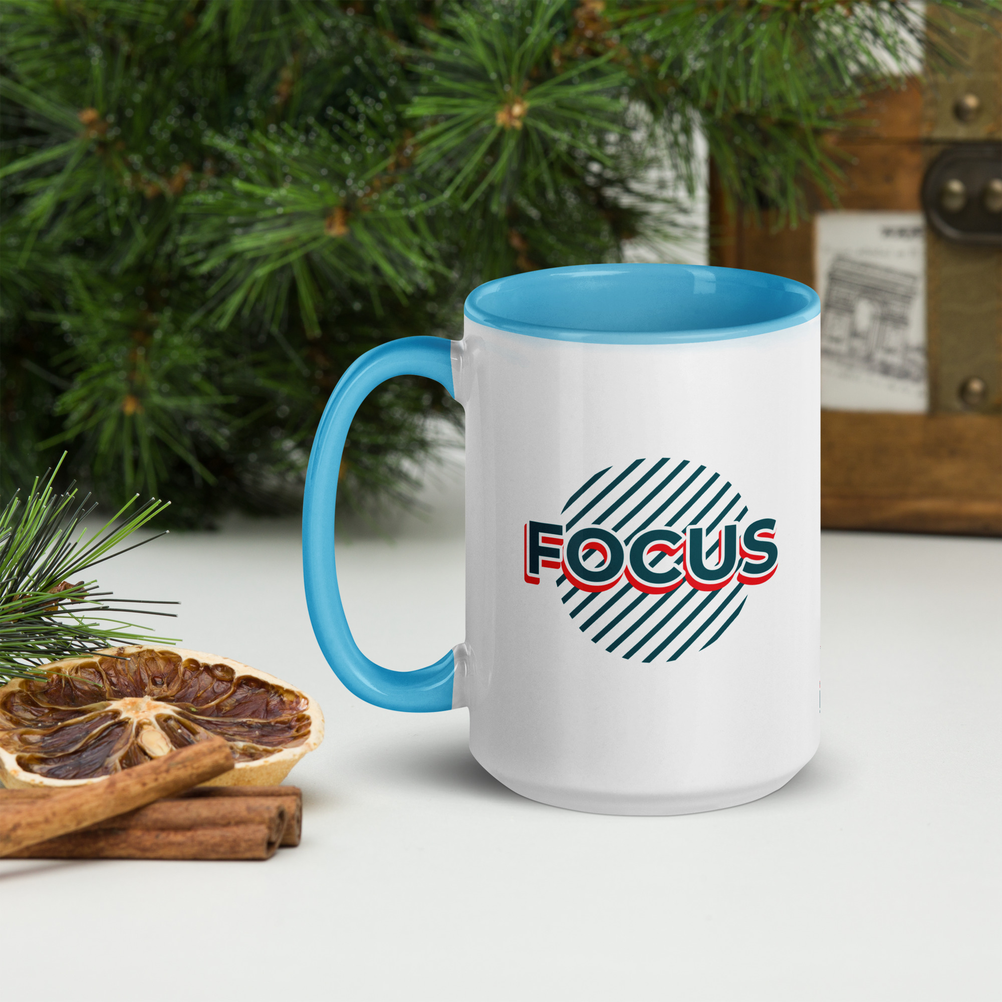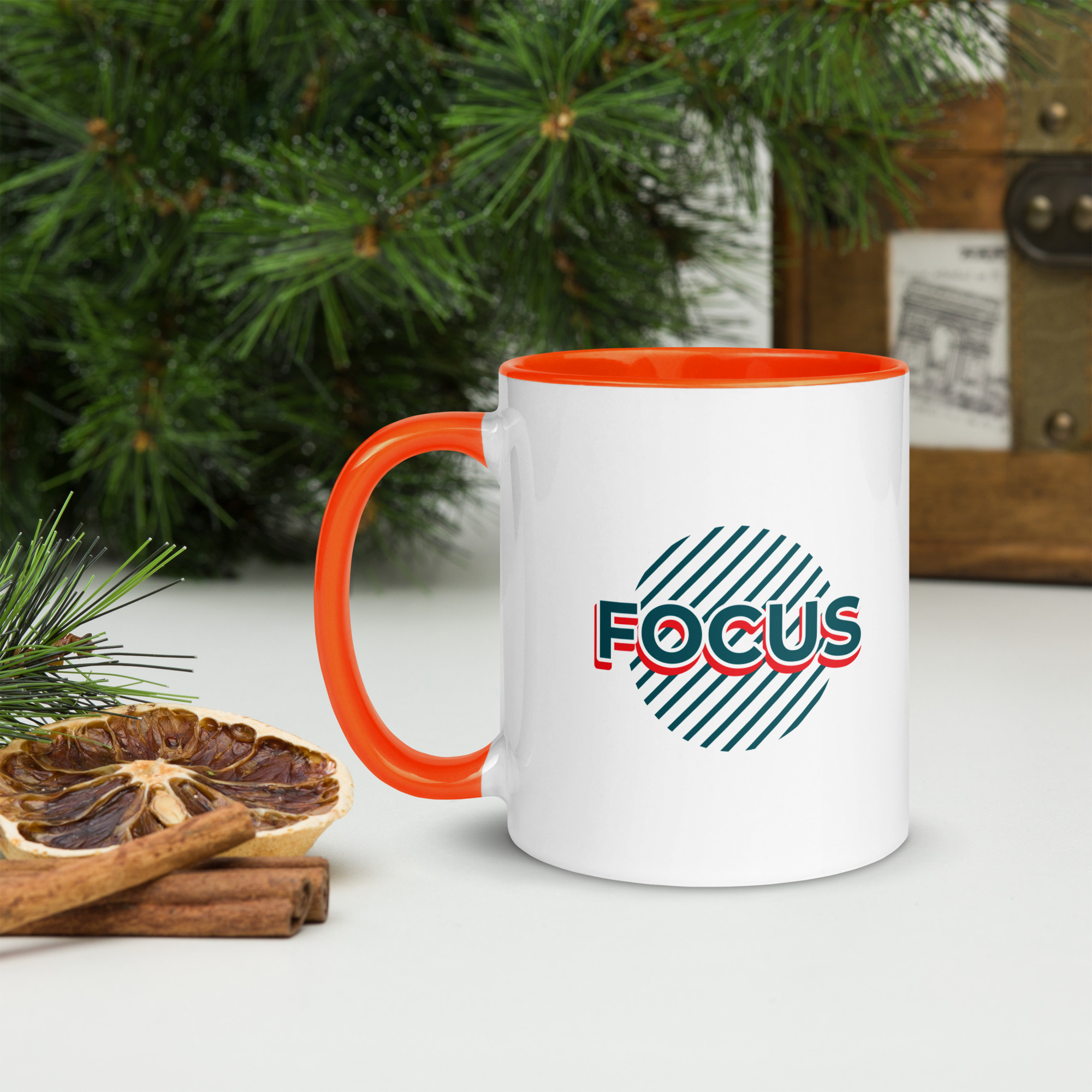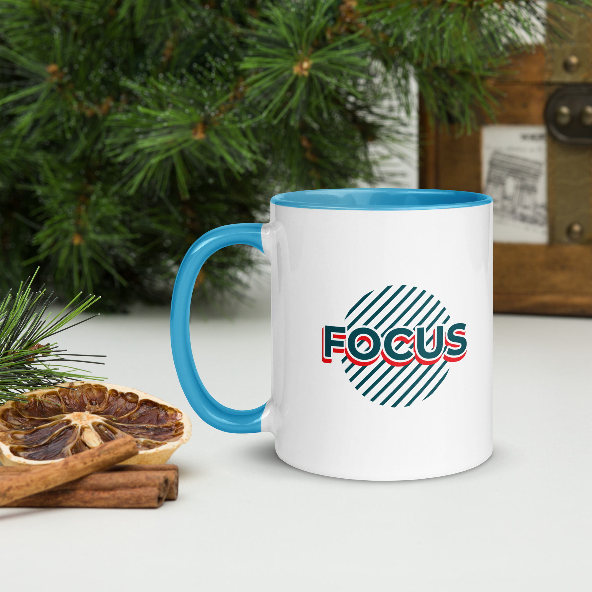 Baltas puodelis su spauda (įv.spalvų). ‘Focus’ dizainas